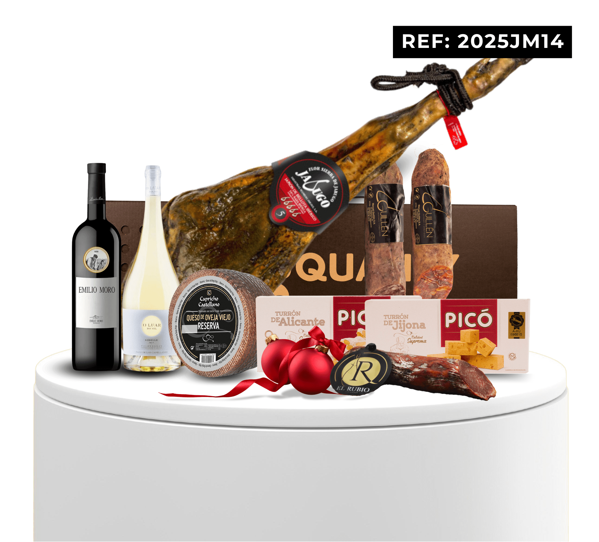 Este exclusivo lote navideño combina la esencia de la gastronomía ibérica con vinos y dulces artesanales, presentados en una caja de cartón de estilo elegante. Perfecto para disfrutar en las fiestas o para regalar, este lote brinda una experiencia completa de sabor y tradición.